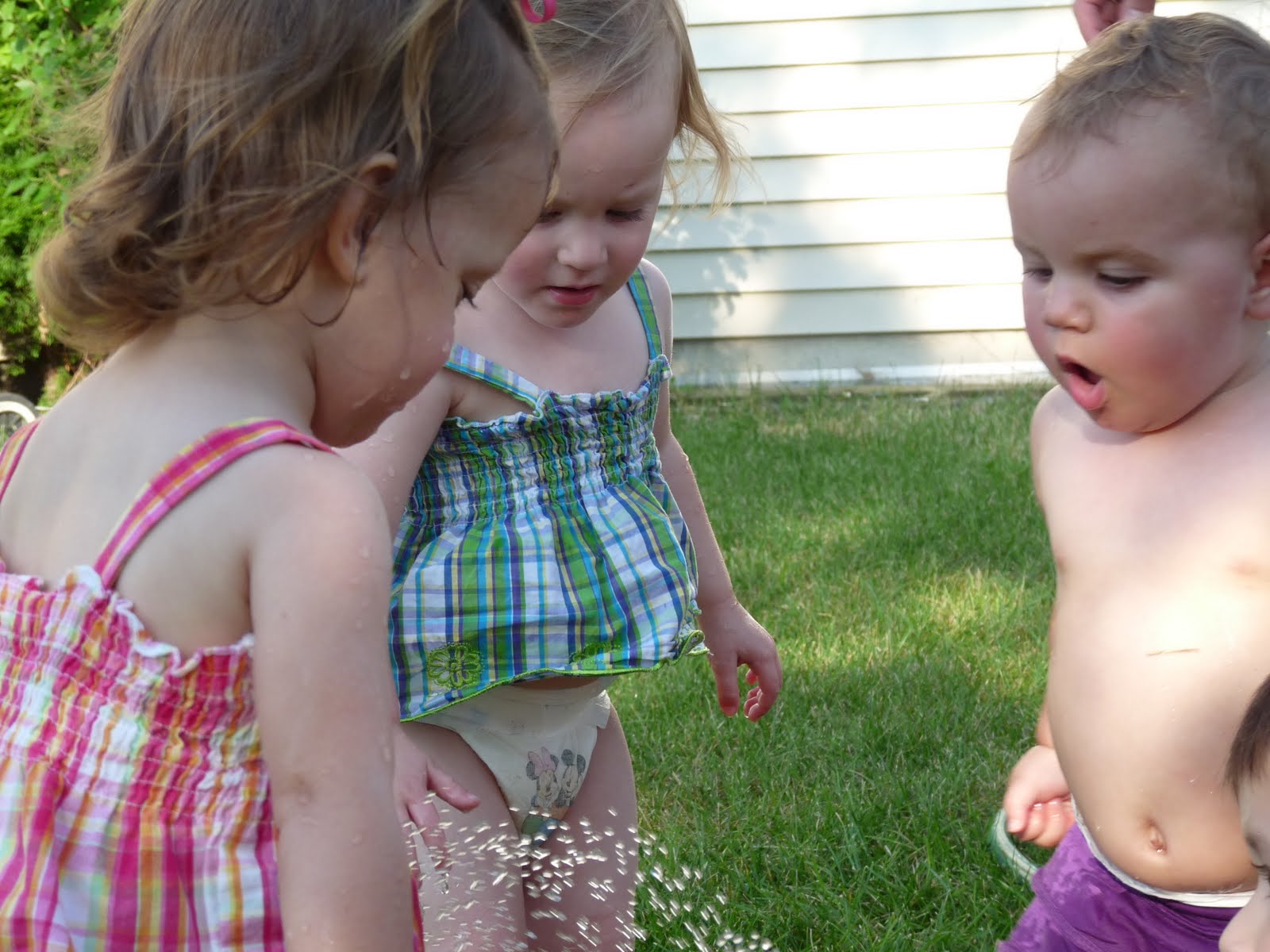 After supper tonight we decided to let the kids wash the spaghetti sauce off with the sprinkler. Ignore the weed patch in the background. The house is nearly set but the yard is another story...